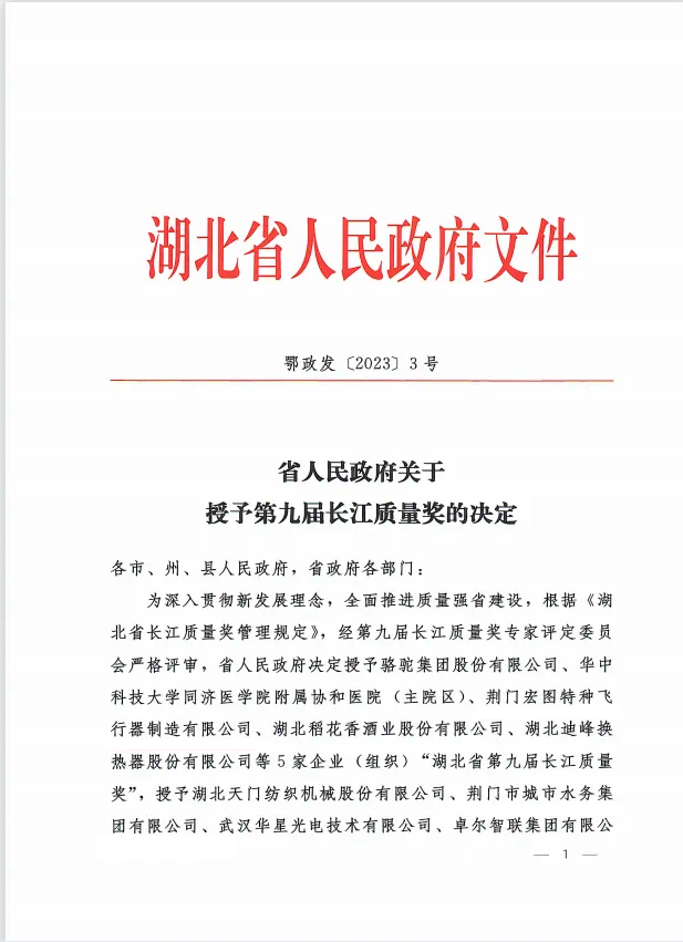 “长江质量奖”始于2008年,是经中央同意,湖北省人民政府设立的省长质量奖,是湖北省最高质量荣誉奖项。长江质量奖主要面向湖北具有法人资格,实施卓越绩效模式,有广泛的社会知名度与影响力,在行业内处于领先地位,取得显著经济效益和社会效益的企业或组织。长江质量奖的设立旨在深入推进“质量强省”战略,提升“湖北制造”竞争力,打造湖北卓越品牌,激励并引导广大企业采用国际先进的卓越绩效管理模式,推动高质量发展。该奖项分为“湖北省人民政府长江质量奖”和“湖北省人民政府长江质量奖提名奖”两个级别,每个级别不超过5家企业(组织)。截至目前,全省共有30家企业(组织)获长江质量奖,44家企业(组织)获提名奖。